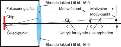 hvor langt foran og bag motivet, motivet synes / opfattes som værende skarpt. Rent teknisk er motivet dog kun helt skarpt gengivet i det motivplan objektivet er fokuseret på. Ved